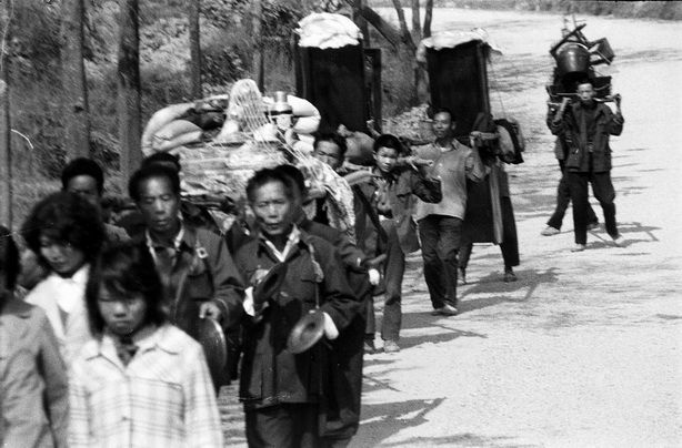 1980年,浙江省泰顺农村抬着嫁妆的迎亲队伍。